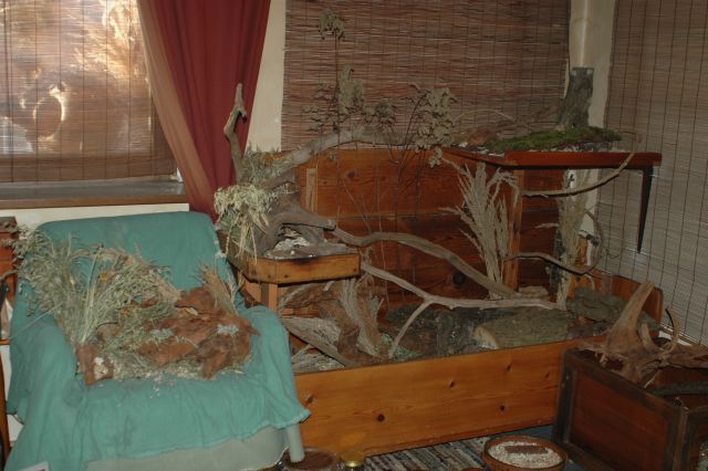 Es sind bis jetzt zwei weitere Ebenen angebracht, eine kleine "Futterküche" und eine "Hochebene". Außerdem gibt es einen "Mäusesessel". Ich wollte über der zweiten Kiste, dem "Heustadl" noch eine neue Kiste (mit Glas vorne) anbringen.